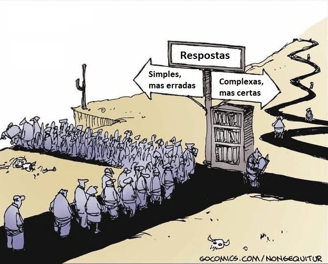 Mas há mais: as respostas complexas são rebeldes, põem frequentemente em causa as nossas ideias feitas. Obrigam-nos a rever e a engolir pressupostos e preconceitos. Fazem-nos tremer o chão. Uma chatice. Não queremos de modo nenhum pôr em causa a maior parte das nossas ideias, dos nossos pressupostos e preconceitos. Queremos apenas uma respostazinha. Que não ponha em causa nada de fundamental em nós. A última coisa que queremos é equacionar as nossas certezas ou admitir que podemos ter estado enganados uma boa parte da nossa vida. Quem quer trocar toda uma vida por uma qualquer verdade?