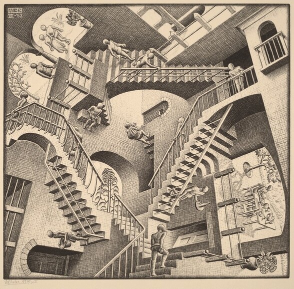 A imagem acima é um trabalho do artista holandês Maurits Escher, cujo título é Relatividade. Para além de criarem efeitos visuais surpreendentes, as obras de Escher são conhecidas por desafiar as leis da lógica convencional.