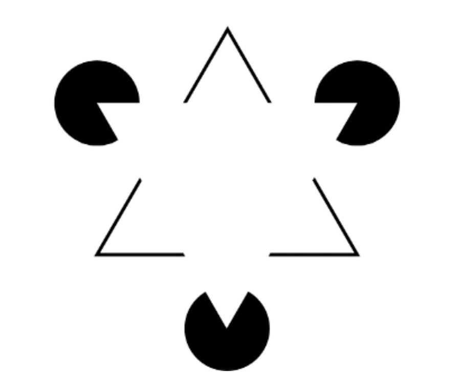 Podemos fazer as conjeturas que quisermos e darmos a nós próprios os argumentos mais convincentes para explicarmos este fenómeno, mas a verdade é que não está ali qualquer triângulo branco. Não sou eu que o digo. É a ciência que o diz. O que a ciência nos ensina é que esta figura, conhecida como triângulo de Kanizsa, mostra que a nossa mente pode ver o que não existe. Nesta imagem, a nossa mente constrói involuntariamente o triângulo a partir dos contornos das figuras a preto.