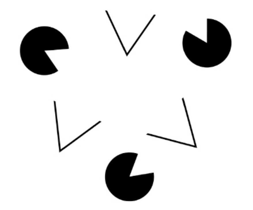 Vale a pena refletir mais uma vez nesta imagem e olhar novamente para todos os elementos que estão ali desenhados a preto, para vermos que não está ali desenhado qualquer triângulo, mas apenas as restantes formas, bem delineadas, a preto. Estamos tão habituados a ver formas destas, que já nem percebemos que a forma não está efetivamente lá.